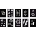 Lot de 10 pochoirs adhésifs repositionnables, assortiment 1. Pochoirs souples, adhésifs et repositionnables qui s’utilisent aussi bien pour réaliser un motif sur du tissu (t-shirts, jeans, vestes, sacs, nappes, coussins) que pour faire un tatouage éphémère sur la peau avec du maquillage. 10 modèles assortis: étoiles, attrape-rêves, ronds psychédéliques, plumes, soleil celte, soleil inca, fleurs, chat, bracelets cœurs et papillon. Dimensions d''une planche de pochoirs (L x l): 10 x 7 cm.