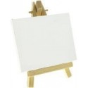Toile à peindre sur chevalet en bois. Carton entoilé blanc à poser sur un chevalet en bois naturel. A décorer avec de la gouache, des marqueurs peinture, des feutres, des cabochons, des paillettes, etc… La toile est amovible et le pied du chevalet se replie. Dimensions de la toile : L.10 x l.10 x ép.1 cm. Dimensions du chevalet : L.8 x H.16 cm.