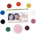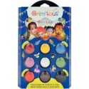 Palette de maquillage à l''eau GRIM''TOUT Carnaval 9 couleurs assortis. Coloris : rouge, jaune, bleu, rose, blanc, vert, orange, marron et noir. Permet de maquiller jusqu''à 50 visages. Contient 9 fards aquarellables de 4 ml, 1 pinceau, 1 éponge et un guide de maquillage. Nettoyage à l''eau et au savon. Maquillage de qualité professionnelle applicable sur la peau au pinceau ou à l''éponge.