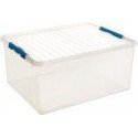 Boîte de rangement transparent 120 litres. Protège de l’humidité et de la poussière. Transparente, pratique, facile à empiler et équipée de clips de fermeture solides pour que le couvercle reste bien en place.