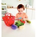 Panier de légumes en tissu. Panier en feutrine rouge garni de 6 légumes en tissu doux et rembourré : une pomme de terre, une tomate, un haricot, une carotte, une aubergine et un chou. Livré avec un couteau en plastique et un manche en bois (L.15 cm) pour écosser le haricot, éplucher le chou et couper en deux la carotte et l’aubergine à scratch. Légumes réalistes de grande taille, faciles à saisir par les petites mains. Favorise la reconnaissance des couleurs et des légumes et développe l’habileté manuelle. Dimensions de la carotte : H.15 x Ø.5 cm. Dimensions du panier : L.21 x l.12 x H.16 cm. Dès 18 mois.