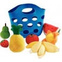 Panier de fruits en tissu. Panier en feutrine bleue garni de 7 fruits en tissu doux et rembourré : une fraise, une pomme, une tranche de pastèque, une poire, un ananas, ainsi qu''une banane et une orange à peler. Fruits réalistes de grande taille, faciles à saisir par les petites mains. Favorise la reconnaissance des couleurs et des fruits et développe l’habileté manuelle. Dimensions de la banane : H.15 x Ø.5 cm. Dimensions du panier : L.21 x l.12 x H.16 cm. Dès 18 mois.