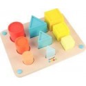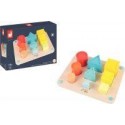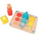 Plateau des volumes en bois. Jouet destiné à l’éveil des petits dans une version en bois avec 3 fonctionnalités : puzzle d''encastrement pour développer la reconnaissance des formes et des couleurs, fonction pyramide avec empilage des cubes, fonction imbrication des pièces pour l''apprentissage des tailles. Jeu d’éveil pour apprendre les volumes tout en développant la motricité fine. Plateau anti-dérapant pour plus de stabilité + 9 volumes en bois. Peintures à l''eau. Dimensions du plateau : L.26,2 x l.20,7 cm. Dès 18 mois.