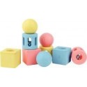 Lot de 9 hochets géométriques en plastique. 9 hochets géométriques aux couleurs acidulées pour stimuler la vue. Hochets en plastique (PMMA) fabriqués à base de riz, légers, doux au toucher et facile à saisir par les petites mains. Hochets à mordiller sans danger, à manipuler, à empiler ou à trier selon leurs formes (cube / boule /cylindre) et leurs couleurs (rose / bleu / jaune). Amusant, lorsque bébé secoue les hochets, il entend les billes et grelots s’agiter à l’intérieur. Développe la motricité fine et la coordination main-œil. Dimensions d’un hochet : L. 4,5 x l. 4,5 x H. 4,5 cm. Dès la naissance.