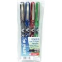 Pochette de 4 rollers V-Ball 0,5 mm couleurs assorties. Ecriture fine, pointe 0.5 mm, tracé 0.3 mm. Roller à pointe métal conique, bille en carbure de tungstène indéformable. Encre liquide à niveau visible. Doté d''un régulateur d''encre. Clip métal sur le capuchon. Couleurs assorties : bleu, noir, rouge, vert.