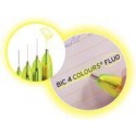 Stylo bille Bic 4 Colours fluo. Stylo multifonctions : 3 pointes bille moyennes + 1 pointe bille large jaune fluo. Ecriture moyenne, pointe 1 mm, tracé 0,3 mm (encres bleue, noire et rouge). Pointe large 1.6 mm (encre jaune fluo pour souligner et entourer). Corps transparent jaune permettant de voir le niveau d''encre. Rétractable et rechargeable pour les encres bleue, noire et rouge.