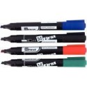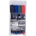 Pochette de 4 marqueurs permanents indélébiles universel First pointe biseautée 1 à 5mm assortis. Corps plastique. Pointe haute résistance. Encre à base d''alcool à faible odeur. Séchage rapide. Sans toluène ni xylène. Marque sur métal, verre, bois, plastique, carton. Résiste à la lumière. Grande durée d''utilisation. Coloris bleu, noir, rouge et vert.