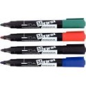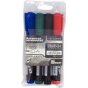 Pochette de 4 marqueurs permanents indélébiles universel First pointe ogive 1 à 3 mm assortis. Corps plastique. Pointe haute résistance. Encre à base d''alcool à faible odeur. Séchage rapide. Sans toluène ni xylène. Marque sur métal, verre, bois, plastique, carton. Résiste à la lumière. Grande durée d''utilisation. Coloris bleu, noir, rouge et vert.