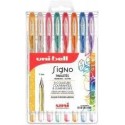 Pochette de 8 stylos gel Signo métallisés. Stylo à encre gel à pigmentation, couleurs couvrantes et lumineuses, écriture fluide et ultra douce. Séchage rapide. Ecriture moyenne, pointe 0.8mm. Idéal sur papiers foncés (scrapbooking, carterie, coloriage.). Système double bille : 50% d''écriture en plus qu''un roller encre gel traditionnel. Stylo à encre gel à pigmentation, couleurs couvrantes et lumineuses, écriture fluide et ultra douce. Séchage rapide. Ecriture moyenne, pointe 0.8mm. Idéal sur papiers foncés (scrapbooking, carterie, coloriage.). Système double bille : 50% d''écriture en plus qu''un roller encre gel traditionnel. Couleurs or, argent, rose, vert, rouge, bronze, bleu, violet métal.