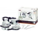 Batterie de cuisine en plastique 8 pièces. En plastique très résistant, de couleurs modernes gris métal et noir brillant. Contient 4 éléments de cuisine avec couvercle: 1 fait-tout, 1 bouilloire, 1 cocotte-minute, 1 poêle + 4 ustensiles: 1 louche, 1 grande cuillère et 2 spatules. De quoi cuisiner comme un vrai chef! Plastique adapté au lave-vaisselle. Dimensions du fait-tout: Ø 12 cm, H. 8 cm. Dès 3 ans.