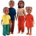 Famille africaine 4 personnes. Famille représentant 2 générations : les parents et les enfants. Figurines en plastique souple dont les membres sont articulés. Vêtements en tissu et chaussures peintes sur le plastique pour ne pas être avalées par les plus petits. Idéal pour associer avec les maisons de poupée. Les enfants peuvent récréer des scènes de la vie quotidienne et développer leur vocabulaire. Hauteur de 9 à 11 cm. Dès 4 ans.