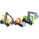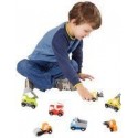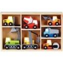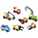 Coffret de 7 véhicules de chantier en bois. Contient 7 engins de chantier en bois coloré et verni faciles à attraper et à manœuvrer: 1 rouleau compresseur, 1 bétonnière, 1 chariot élévateur, 1 camion-benne, 1 chargeur frontal, 1 grue et sa palette, 1 pelleteuse. Roues indémontables en plastique et en métal qui permettent un roulement silencieux. Les véhicules se rangent facilement dans les 7 compartiments du coffret en bois. Dimensions de la bétonnière: L. 8 x l. 3,5 x H. 7 cm. Dès 3 ans.