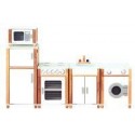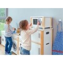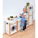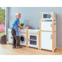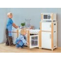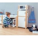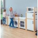 Coin cuisine équipée en bois. Composée de 5 éléments de petite taille dont la conception est similaire à celle des vrais meubles de cuisine. Meubles à monter soi-même. Structure en bois d''hévéa et MDF, portes blanches. Comprend : 1 plaque de cuisson et 1 four, 1 réfrigérateur, 1 micro-onde, 1 meuble évier et 1 machine à laver. Jeu d''imitation favorisant l''apprentissage des petits, tout en les amusant. Qualité de fabrication qui confère résistance et durabilité pour un usage intensif en collectivités. Dimensions de l''élément four, de la machine à laver, plaques de cuisson et du meuble évier (L x l x H): 40 x 34 x 53 cm. Dimensions du réfrigérateur (L x l x H): 40 x 34 x 79 cm. Dimensions du micro-onde (L x l x H): 36 x 28 x 24,5 cm. Dès 2 ans.