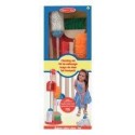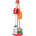 Kit de nettoyage en bois, 6 pièces. Jeu d''imitation contenant 1 support en bois massif et ses 5 accessoires de nettoyage: 1 balai à franges, 1 balai brosse, un attrape-poussières, une balayette sa pelle en plastique. Seul le pied du support est à monter et à fixer avec une vis. Hauteur du support: 74 cm. Dimensions des 2 grands balais: 66 cm. Dès 3 ans.
