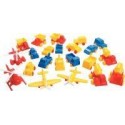 Lot de 22 véhicules assortis en plastique. 2 hélicoptères, 2 avions, 2 camions toupie, 4 camions avec benne basculante, 2 dépanneuses, 2 jeeps, 2 4x4, 2 camions, 1 coupé sport et 3 voitures. En plastique semi-rigide très résistant, les roues sont indémontables. Cet ensemble peut aussi servir de matériel de tri. Longueur des véhicules : de 8,5 à 15 cm selon les modèles. Dès 3 ans.