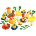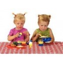 Maxi dînette de 78 pièces pour 6 couverts. Dînette complète pour 6 personnes. En plastique très résistant, adapté au lave-vaisselle. 1 cafetière et 1 pichet d’eau avec couvercles, 6 assiettes plates (Ø 13 cm), 6 assiettes creuses, 6 verres, 6 cuillères à soupe, 6 cuillères à café, 6 couteaux, 6 fourchettes, 6 tasses à café et leurs sous tasses, 2 sucriers avec couvercles et cuillères, 2 pots à lait, 6 coquetiers et 6 œufs à la coque. Dès 3 ans.
