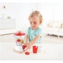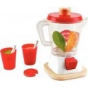 Blender pour smoothie en bois. 12 pièces en bois et en plastique : 1 blender (socle + bol + couvercle), 2 gobelets, 2 pailles, 3 morceaux de fruits et de légumes en bois et 4 en feutrine. L’enfant place les ingrédients de son choix dans le blender et appuie sur le bouton rouge pour les faire tourner comme dans un vrai robot ménager ! Fonctionne sans pile. Dimensions du blender : L.12 x l.12 x H.20 cm. Dès 3 ans.