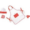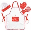 Tablier de cuisine et accessoires. Contient 4 pièces en tissu : un tablier à nouer avec une poche, une toque, un gant et une manique + 5 cuillères à mesurer en plastique. La panoplie indispensable des petits cordons bleus. Attention, le gant et la manique ne résistent pas la chaleur. Polyester, lavable à la main. Dimensions du tablier : L.44 x H.53 cm. Dimensions du gant : L.16 x H.21 cm. Dès 3 ans.