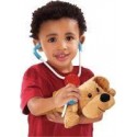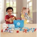 Matériel de soins vétérinaire. Trousse en tissu avec poignée pour ranger tout le matériel nécessaire aux soins vétérinaires. Livré avec 2 peluches, un chien et un chat et de nombreux accessoires : un stéthoscope, un thermomètre (L.13 cm), une paire de ciseaux,, 1 tube de crème, 4 flacons, un bandage, un plâtre pour les bobos, une collerette, etc… Tout est prévu, y compris une liste de contrôle réutilisable. Développe l’affectif et le vocabulaire des enfants. Complément idéal au centre de soins vétérinaire 85853. Dimensions du chien : L.23 x l.14 x H.9 cm. Dimensions du sac : L.25 x H.18 cm. Dès 3 ans.