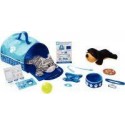 Valisette de transport + 2 peluches. Sac de transport en tissu, souple, confortable avec pognée pour transporter son animal en toute sécurité. Livré avec 2 peluches un chien et un chat, de nombreux accessoires : un harnais, une laisse, une gamelle, une balle, 2 pièces d’identité réutilisables, une liste de contrôle, plusieurs pochettes de rangement, 1 matelas amovible, un filet fenêtre et une grande fermeture éclair. Complément idéal au centre de soins vétérinaire 85853. Peluches et valisette lavable en machine à 30% cycle délicat. Dimensions du chien : L.23 x l.14 x H.9 cm. Dimensions du sac : L.27 x l.22 x H.19 cm. Dès 3 ans.