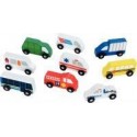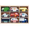 Coffret 9 véhicules urbains bois. 9 véhicules en bois coloré et verni faciles à saisir et à manœuvrer : 1 bus scolaire, 1 camion de recyclage, 1 camion de pompier, 1 camion benne, 1 dépanneuse, 1 camion livreur, 1 bus de ville, 1 marchand de glaces et 1 ambulance. Roues indémontables en plastique et en métal qui permettent un roulement silencieux. Les véhicules se rangent facilement dans les 9 compartiments du coffret en bois. Dimensions moyennes d’un véhicule : L. 10 x l. 3,5 x H. 7 cm. Dès 3 ans.