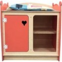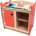 Table à langer pour poupées en bois. Structure en contreplaqué bouleau naturel. Les 2 côtés et la porte sont laqués corail.  Joliment décorée avec 1 porte et 2 compartiments de rangement avec 1 étagère. Livré avec un matelas à langer. A monter soi-même.  Dimensions (L x l x H): 58 x 38 x 58 cm. Hauteur du plan de travail : 49 cm. Dès 10 mois.