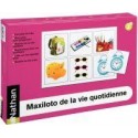 Maxiloto vie quotidienne. Un jeu de loto pour sur le thème de la maison : la salle de bains, la cuisine, les aliments, les vêtements, les jouets et des objets. • La boîte contient : 6 planches de jeu, 36 jetons des objets en carton et 1 livret pédagogique. • L/l planche : 33 x 23 cm. • Côté jeton : 10 cm. Dès 2 ans.