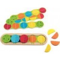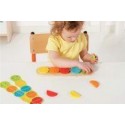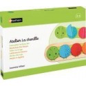 Atelier la chenille. Jeu de manipulation conçu pour apprendre les couleurs et les premières notions spatiales. La chenille est composée de 10 pièces amovibles dont une face est de couleur unie et l’autre à motifs. La tête, de couleur verte, se positionne à droite ou à gauche. L’enfant associe les pièces deux à deux pour constituer le corps de la chenille. À chaque nouvelle association, une chenille différente apparaît ! Les fiches modèles sont de difficulté progressive et se placent au fond du support. La boîte contient 12 fiches modèles recto verso, soit 24 activités (30 x 6 cm), 2 supports en bois (L/l/ép. : 32,6 x 8,6 x 0,8 cm), 20 pièces en bois de 5 couleurs, soit 2 lots de 10 (L/l/ép. : 6 x 3 x 1 cm) et 1 livret pédagogique. Dès 3 ans.