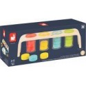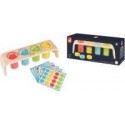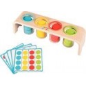 Le tri des couleurs. Contenu : 1 support en bois 31.5x8x8cm, 4 tubes en plastique, 16 jetons colorés, 6 cartes d’activités recto/verso. But du jeu : L’enfant pourra jouer de 2 manières différentes : en suivant la couleur des tubes pour placer les jetons, ou en choisissant une carte d’activités pour reproduire le modèle. Intérêt pédagogique : Reconnaissance des couleurs A partir de 2 ans