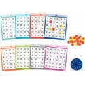 Loto des multiplications. Contenu de la boîte : 4 cartes en carton épais (23x20 cm), une roulette numérotée de 0 à 9, 40 jetons translucides de 2 couleurs. But du jeu : le joueur choisit une des tables de multiplications, il tourne la roulette et place les jetons, il doit ensuite d’une autre couleur recouvrir la réponse de l’opération si la réponse figure sur sa carte. Intérêts Pédagogiques : Apprentissage des multiplications et rapidité A partir de 7 ans