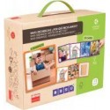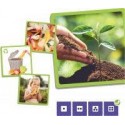 Pourquoi recyclons-nous?. Contenu de la boîte : 20 cartes en carton épais (11.5x11.5cm) représentant 5 séquences de 4 cartes. But du jeu : les séquences sont identifiées d’une couleur, l’enfant devra après observation les ordonner dans la chronologie qu’il pense correcte. En retournant la carte il vérifiera si sa réponse est correcte. La notice propose plusieurs autres activités. Intérêts Pédagogiques : Apprendre le processus de recyclage de différents types de déchets, développer l’observation et la chronologie. A partir de 3 ans
