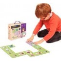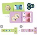 Eurodomino. Contenu de la boîte : 28 dominos géants (13x6.5cm) en carton épais et 15 jetons ronds. But du jeu : on joue avec la face verte ou violette du domino. Chacun leur tour, les joueurs doivent placer l’un de leur jeton correspondant à l’une des extrémités du domino. Si le joueur n’en possède pas, il prendra un jeton dans la pile. Le premier joueur qui n’aura plus d’argent gagnera la partie. Intérêts Pédagogiques : Connaître les pièces et billets, travailler la décomposition et le calcul mental. A partir de 4 ans