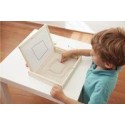 Coffret de pré-écriture avec sable. Contenu : 1 coffret en bois plateau + tableau 30x23x4cm, 1 sachet de 500g de sable, 1 crayon effaçable à sec, 3 craies, 1 effaceur, 1 lisseur pour le sable. L’enfant reproduit dans le sable ce qu’il voit sur le tableau, lettres, nombres, dessins… Permet d’apprendre par le toucher, développe la coordination œil-main, et l’apprentissage de l’écriture. Inspiré de la méthodologie MONTESSORI A partir de 3 ans.
