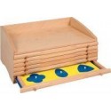Cabinet de géométrie. Le cabinet de géométrie est un meuble en hêtre massif composé de 6 tiroirs amovibles pouvant contenir chacun 6 plateaux puzzles avec au total 35 formes géométriques assorties en bois à encastrer : disques de diamètres croissants, triangles, polygones, quadrilatères, figures courbes. Ce matériel offre à l’enfant l’opportunité de faire des discriminations visuelles et tactiles de formes géométriques plus ou moins complexes. Dimensions du plateau puzzle: L. 14 x l. 14 cm. Dimensions du cabinet : L. 49 x l. 34 x H. 23 cm. Dès 3 ans.