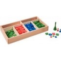 Jeu des timbres. Grande boite en bois naturel verni avec 6 compartiments contenant des timbres de différentes couleurs, de même taille (2 x 2 cm) représentant les quantités du système décimal : 1, 10, 100, 1000. Avec 27 petites quilles et des jetons de 3 couleurs assorties + 1 grande quille verte. Ce matériel sert de support pour toutes les opérations mathématiques (additions, soustractions, divisions et multiplications). Dimensions de la boite : L. 30 x l. 17 x H. 5 cm. Dès 6 ans.