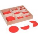 Boite de disques de fractions. Grande boite en bois avec 10 compartiments et un couvercle contenant 10 disques entiers et 5 séries de disques divisés en fractions de 1/10 à 1/2. Les disques sont en plastique rouge. Un matériel de la pédagogie Montessori très simple et efficace qui aide à la compréhension des fractions. Diamètre du disque entier: ø 10 cm. Dès 7 ans.