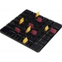 Squadro. Contenu de la boîte : 1 magnifique plateau de jeu en bois noir (26x26 cm), 10 pièces de jeu en bois (5claires et 5 foncées) et une règle du jeu. But du jeu : les joueurs disposent chacun de 5 pièces de même couleur. A chaque tour ils vont en déplacer une en respectant sa capacité de déplacement. Le vainqueur est le premier joueur qui parvient à ramener 4 de ses pièces à leur point de départ après avoir traversé le tableau dans les deux sens. A partir de 8 ans 2 joueurs Durée de la partie : 20 minutes