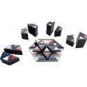 Stackers. Contenu de la boîte : 1 plateau de jeu hexagonal (11cm) en PVC, 60 pièces empilables, 4 supports à pièces et une règle du jeu. Chaque pièce est composée de 3 motifs. Il suffit que 2 motifs soient identiques pour pouvoir les superposer. On créé ainsi une construction qui, au fur et à mesure que le jeu avance, est de plus en difficile à maintenir en équilibre. A partir de 6 ans De 2 à 4 joueurs