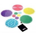 Boîte de 10 pièces sensorielles souples. 10 cercles sensoriels en PVC souple (5 paires ø 8 et 5 paires ø 35cm). L''enfant plonge sa main dans le sac en tissu dans lequel il aura placé les petits cercles en PVC et doit reconnaitre avec ses pieds le grand cercle parmi les 5 posés au sol dont la structure est identique. Idéal pour développer le sens du toucher. L''utilisation d''un bandeau sur les yeux est recommandé.