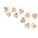 Mémo des poids. ~~Contenu de la boîte : 12 pièces triangulaire en bois léger de 7cm de côté avec 6 poids différents. But du Jeu : l’enfant se saisir de 2 pièces et les secoue une fois. Si il pense soupeser le même poids il les place devant soi et doit alors découvrir 2 pièces de la même couleur. A partir de 3 ans.