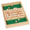 Double jeu SHUT THE BOX en bois. Contenu de la boîte : Un support en bois très qualitatif (33x23cm) avec au centre 2 réglettes de jetons avec des jetons de 1 à 9 et de chaque côté une mini piste avec de la feutrine verte, 4 dés en bois. But du Jeu : On lance les 2 dés et on additionne le score. L’enfant peut ensuite rabattre les chiffres encore relevés. Exemple : Score des 2 dès 9, l’enfant peut rabattre le 9 ou 8 et 1 ou 7 et 2 ou 6 et 3 ou 5 et 4. Rabattre un grand nombre, ou même la totalité des chiffres de la rampe le premier. A partir de 6 ans