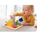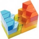 Boite de construction en 3D 28 pièces. Contenu de la boîte : 1 cadre en bois (20,5x20,5 cm), 28 pièces en bois de tailles et couleurs différentes, 15 cartes modèles (15x11 cm) en carton épais. Blocs 3D de belle qualité permettant de créer une multitude de constructions diverses et variées. L’enfant retranscrit un des 15 modèles classés par difficulté ou laisse libre cours à son imagination. A partir de 2 ans.