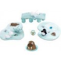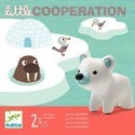 Little coopération. Contenu : 4 animaux en plastique, 3 plateaux de jeux en carton épais, 6 piliers en bois, 1 dé en bois, et 1 règle du jeu. But du jeu : Amener tous les animaux sur la banquise igloo avant que le pont ne s’écroule. Si le pont s’écroule avant que tous les animaux soient sur la banquise, tous les joueurs ont perdu la partie. Intérêt pédagogique : Apprendre à jouer ensemble, premières notions des règles du jeu. De 2 à 4 joueurs. Durée de la partie environ 10 minutes A partir de 2 ans _.