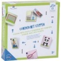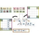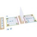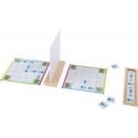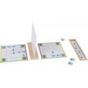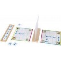 Codage avec les points. Contenu : 2 plateaux de jeu en plastique 19x19cm, 1 cloison de séparation en plastique 19x19cm, 1 support de cartes en bois 26.3x6cm, 16 cartes plastifiées 3.5x3.5cm représentant les 2 séries d’instruction, 20 cartes flèches plastifiées 3.5x3.5cm, 15 cartes points plastifiées 3.5x2cm, et 1 règle du jeu. But du jeu : Se joue à 2. Chaque joueur prend un plateau de jeu. Un des 2 joueurs choisit une série d’instructions (4 cartes), il pose les 4 cartes sur les carreaux de couleur de son plateau. Son équipier fait de même. Le 1er joueur définit le point d’arrivée et indique le chemin à parcourir avec les cartes flèches. Il doit retranscrire sur le support de cartes le chemin pour arriver au but en transformant son codage en point. Son équipier doit retrouver l’arrivée en suivant les instructions de codage. Intérêt pédagogique : Apprentissage du codage, et transformation d’un code long en code court. A partir de 5 ans Pour 2 joueurs