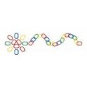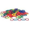 Sachet de 200 maxi chainons 75 x 50 mm. 4 couleurs assorties : bleu, rouge, vert, jaune. En plastique souple, lisse, ultra résistant. Leur format est particulièrement bien adapté aux petites mains et leur structure rainurée permet de les assembler facilement. Ce matériel convient également très bien aux premières activités de logique : tri, classement...