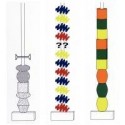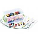 Atelier de perles à enfiler. Contenu : 120 perles de 6 formes différentes et de 5 couleurs assorties, 4 lacets, 2 abaques en bois (6 x 6 cm, hauteur : 22.5 cm), 2 miroirs, 24 cartes d''activités en plastique recto / verso (L x l : 6 x 22 cm). But du jeu : Reproduire les séquences de perles selon la forme et la couleur conformément aux cartes d''activités. Sur les cartes d''activités, le recto est en couleur et le verso est en noir et blanc. Permettent différentes missions : Assembler un modèle, continuer la réalisation d''un modèle, créer une image réfléchie d''un modèle, compléter les perles manquantes dans un modèle. Intérêt pédagogique : Reconnaitre les couleurs et les formes. Excellent pour la coordination visuelle et la motricité fine. Transposition d''un plan horizontal à un plan vertical, d''une surface plane à un volume. Jeu pour 4 enfants Livré dans une boite en plastique avec couvercle. A partir de 3 ans.