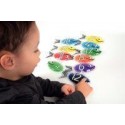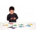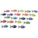 Boite de 21 poissons les chiffres en gel. 21 chiffres en perles colorées gélifiées. Un coté avec le chiffre et l’autre avec la représentation du chiffre en point. Parfait pour l’apprentissage et la reconnaissance des chiffres, le comptage. Ils peuvent être accrochés grâce à l’œillet d’attache. Dimensions d’une lettre (LxH) : 15x8cm A partir de 3 ans.