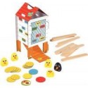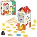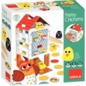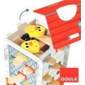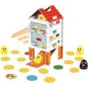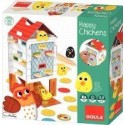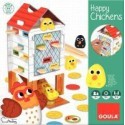 Happy Chicken. Contenu du Jeu : 1 poulailler à monter en carton épais, 5 petits poulets et 12 bâtons en bois. But du jeu : un jeton est retourné, selon la couleur il sortira un bâton du trou de la couleur correspondante. Un poulet ou plusieurs poulets seront libérés, attention il faut que la couleur corresponde pour gagner le jeton. La notice propose une variante pour les plus aguerris. Intérêts Pédagogiques : Observation et chance. A partir de 3 ans Durée de la partie : 10mn De 2 à 4 joueurs