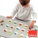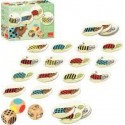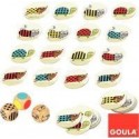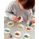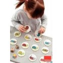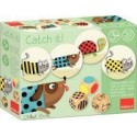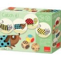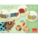 Catch it. Contenu du Jeu : 27 cartes en carton (Diam 6cm), 3 dés en bois et une notice de jeu. But du jeu : Les cartes mélangées sont placées face animal visible. A tour de rôle l’enfant lance les 3 dés et tous les joueurs doivent en même temps trouver la combinaison indiquée par les dés : animal, couleur et motifs. Intérêts Pédagogiques : Observation, rapidité. A partir de 3 ans