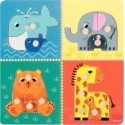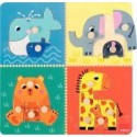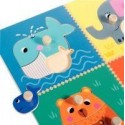 Encastrement en bois 14 pièces, mamans et bébés animaux. Contient 1 plateau et 14 pièces en bois épais avec boutons de préhension. L’enfant doit reconstituer 4 encastrements progressifs et associer chaque bébé (1 pièce) à sa maman : une baleine (1 pièce), un éléphant (2 pièces), un ours (3 pièces) et une girafe (4 pièces). Exercice d''association et de logique qui encourage l’habileté manuelle. Dimensions du plateau : L.28 x l.28 x ép.0,8 cm. Dès 2 ans.